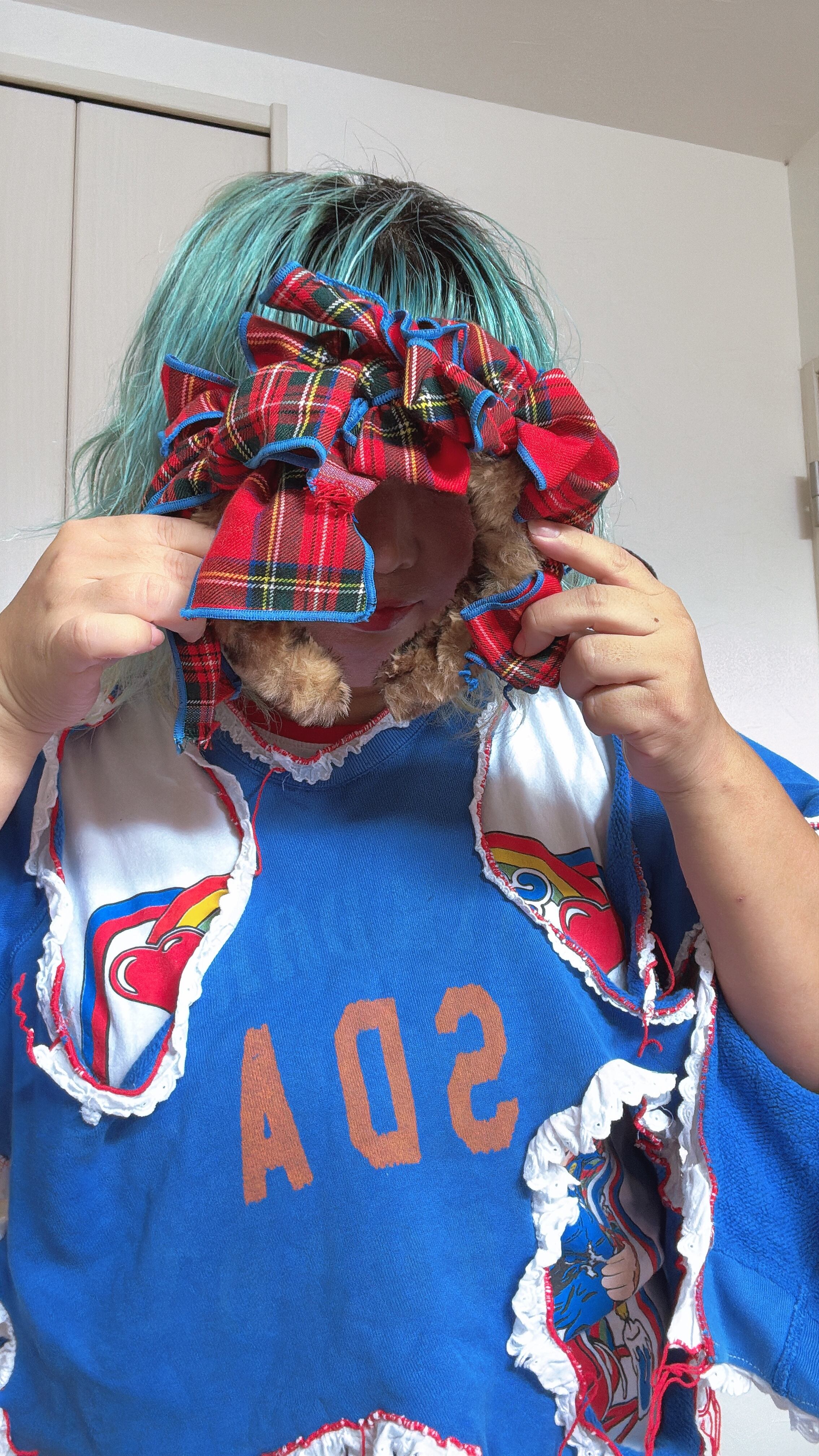 赤のタータンチェックに水色のメローを施し