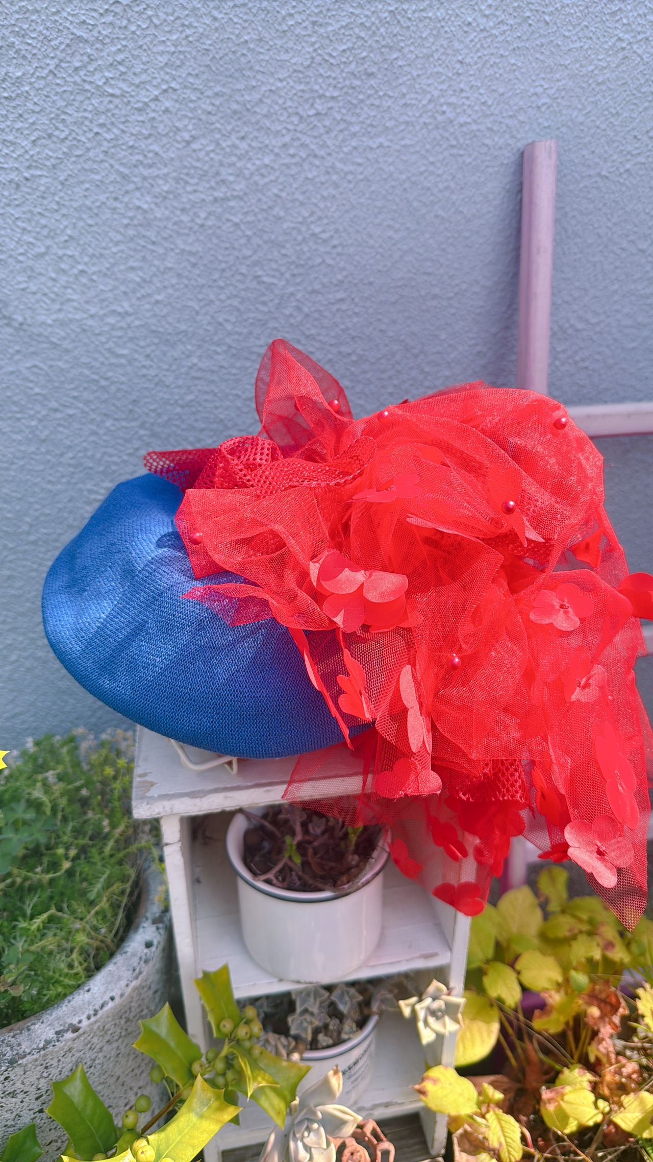 3種類の赤メッシュ、赤チュールと赤お花刺繍チュールのリボンを装飾した