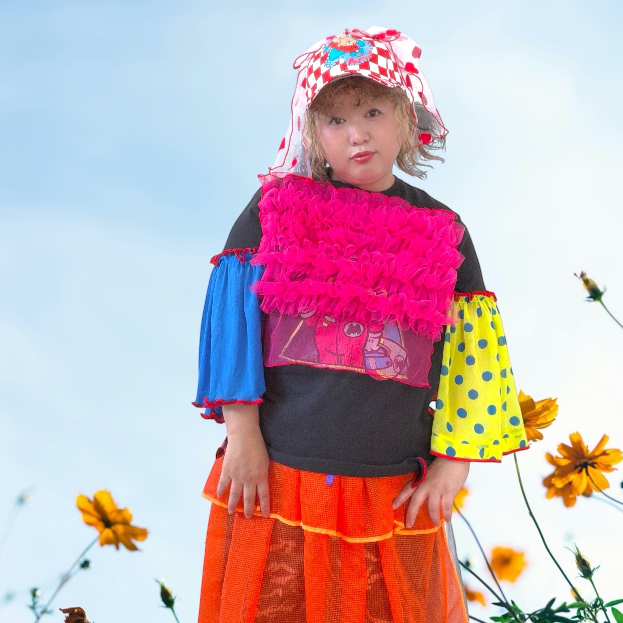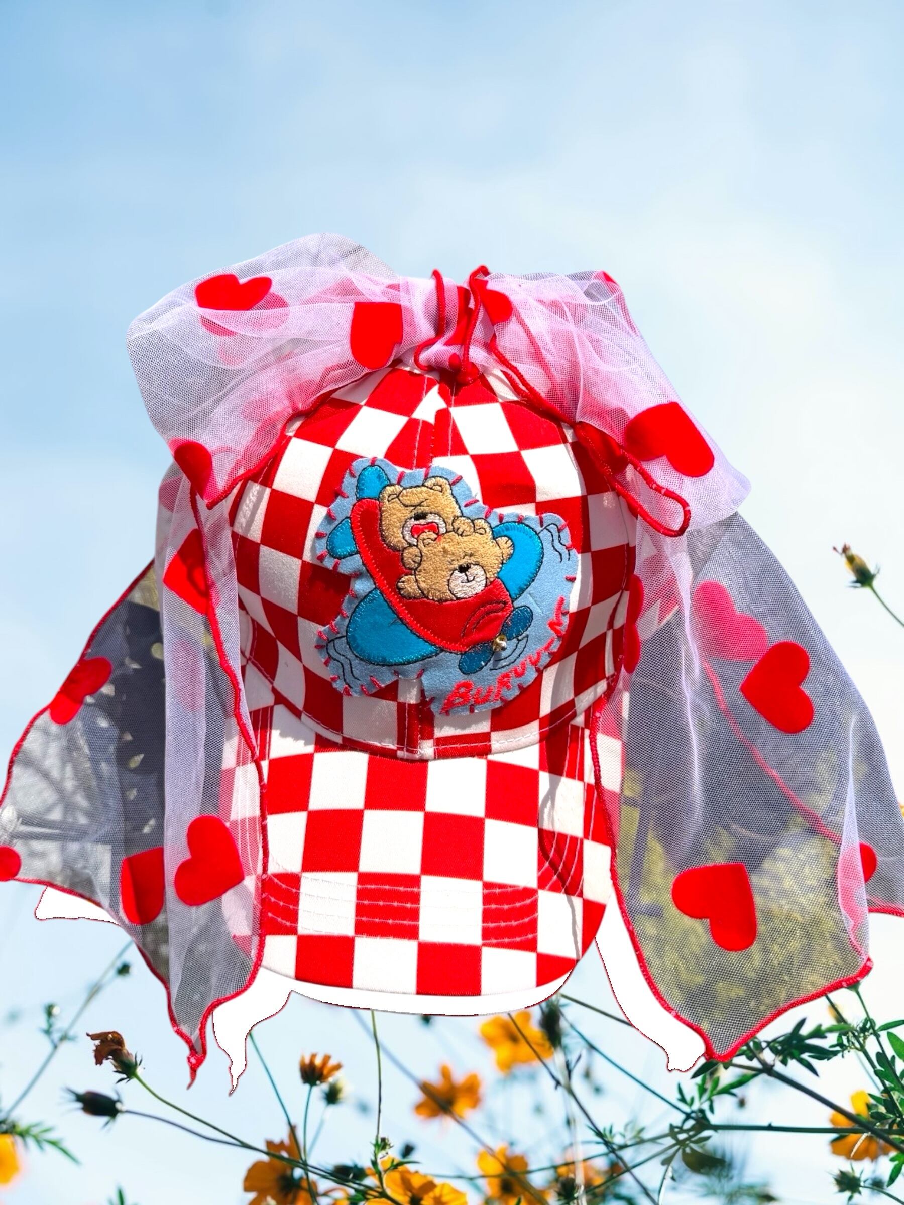 チュールリボンにクマちゃんのヴィンテージワッペンを施したリメイクリボンキャップです