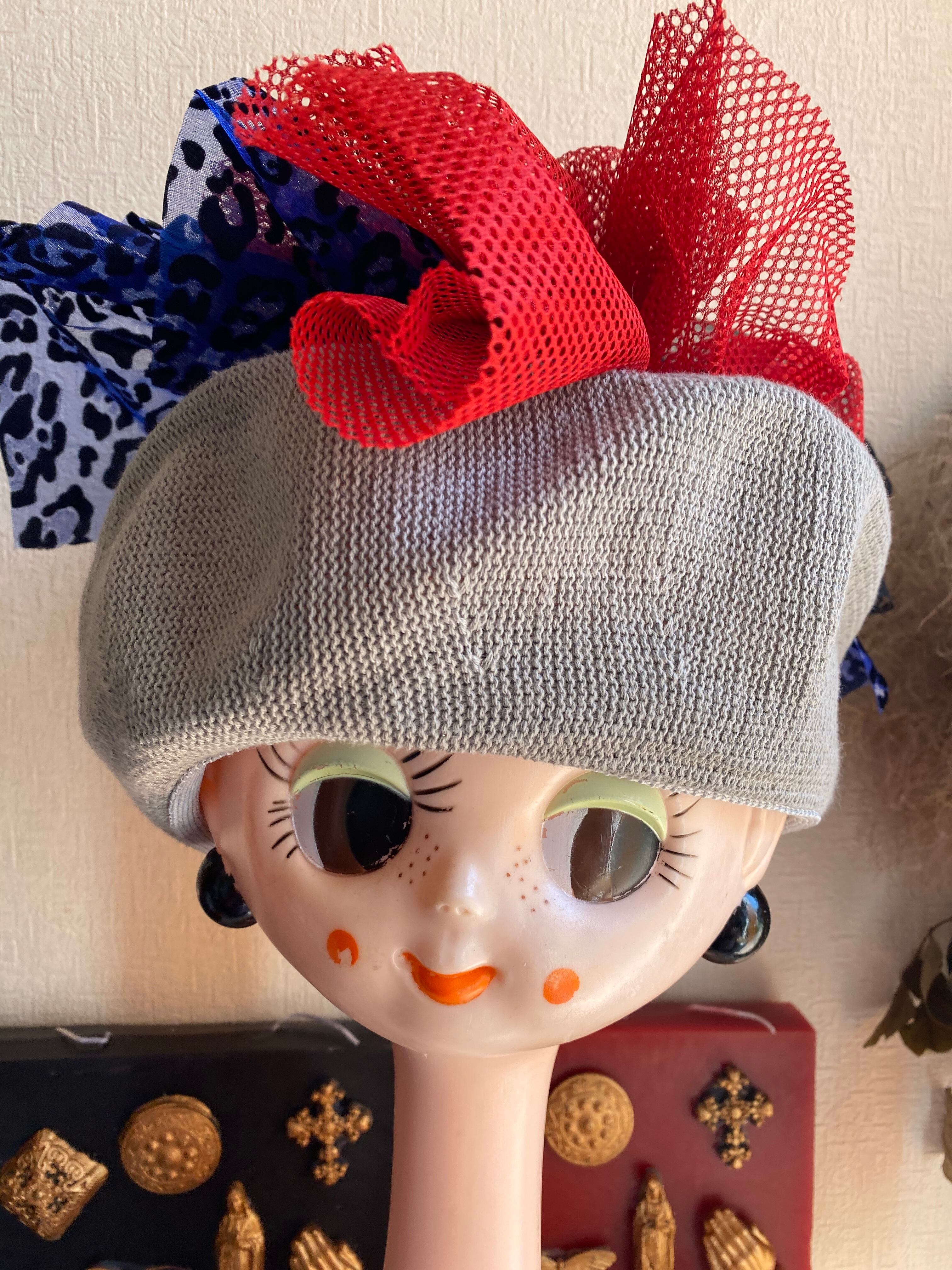 赤メッシュ等の装飾が付いた個性的なお帽子になります