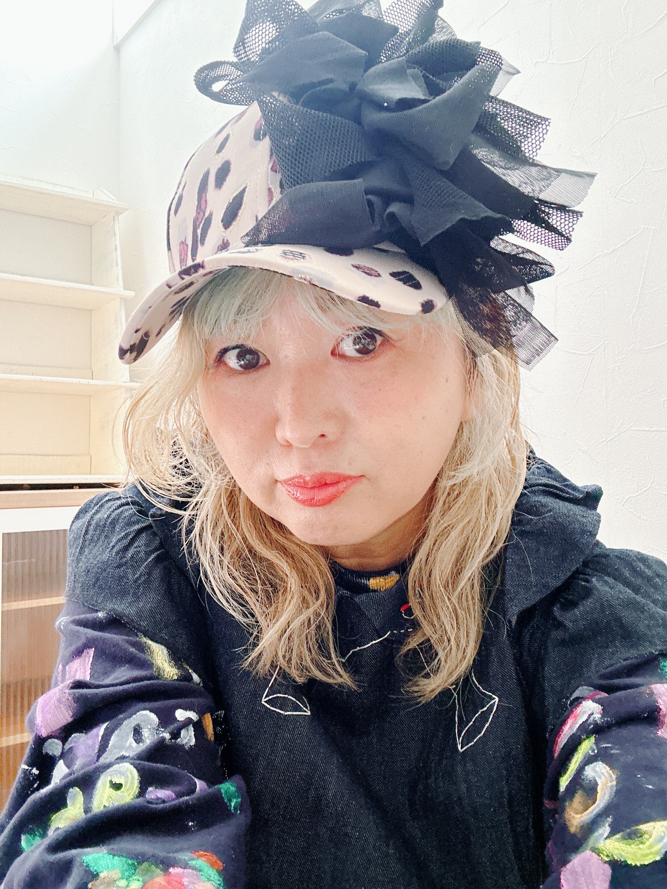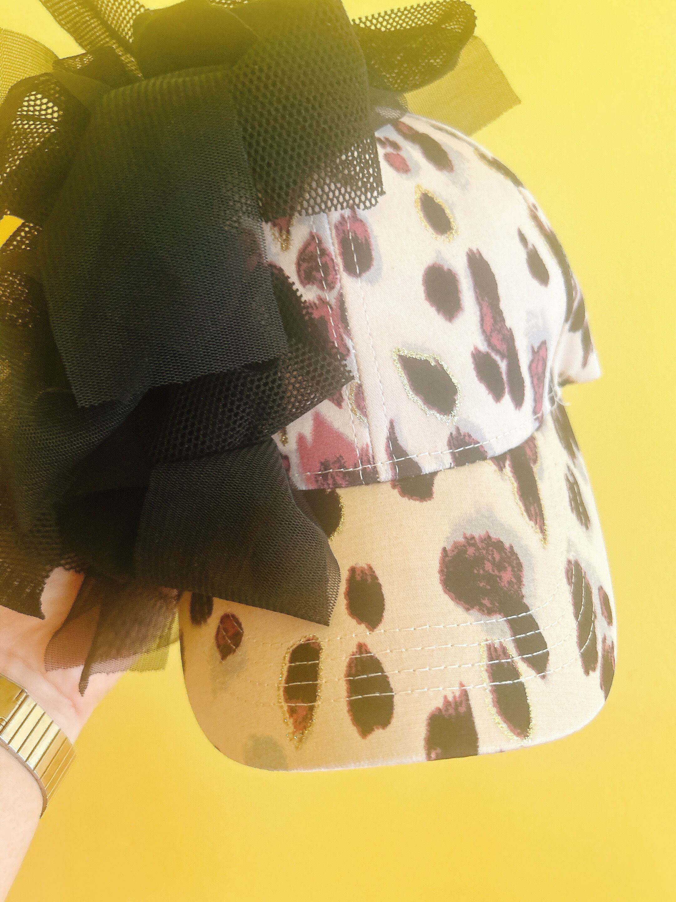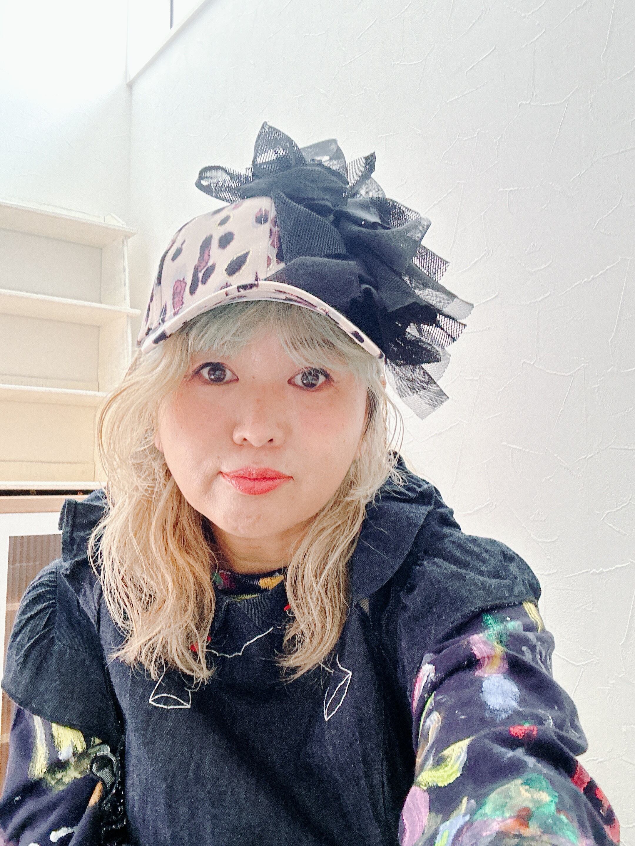 ヒョウ柄のcapに3種の黒いリボンを装飾しました