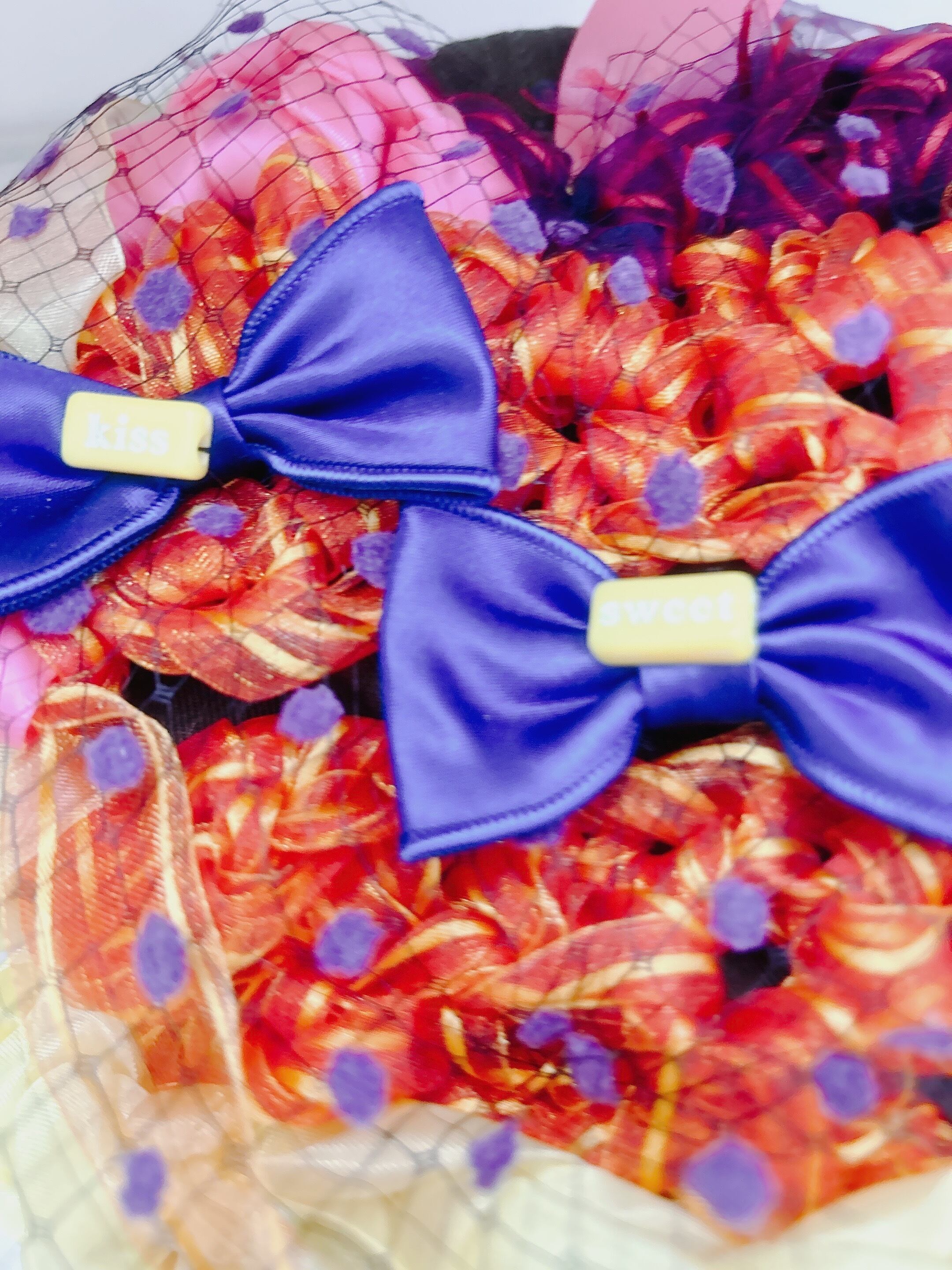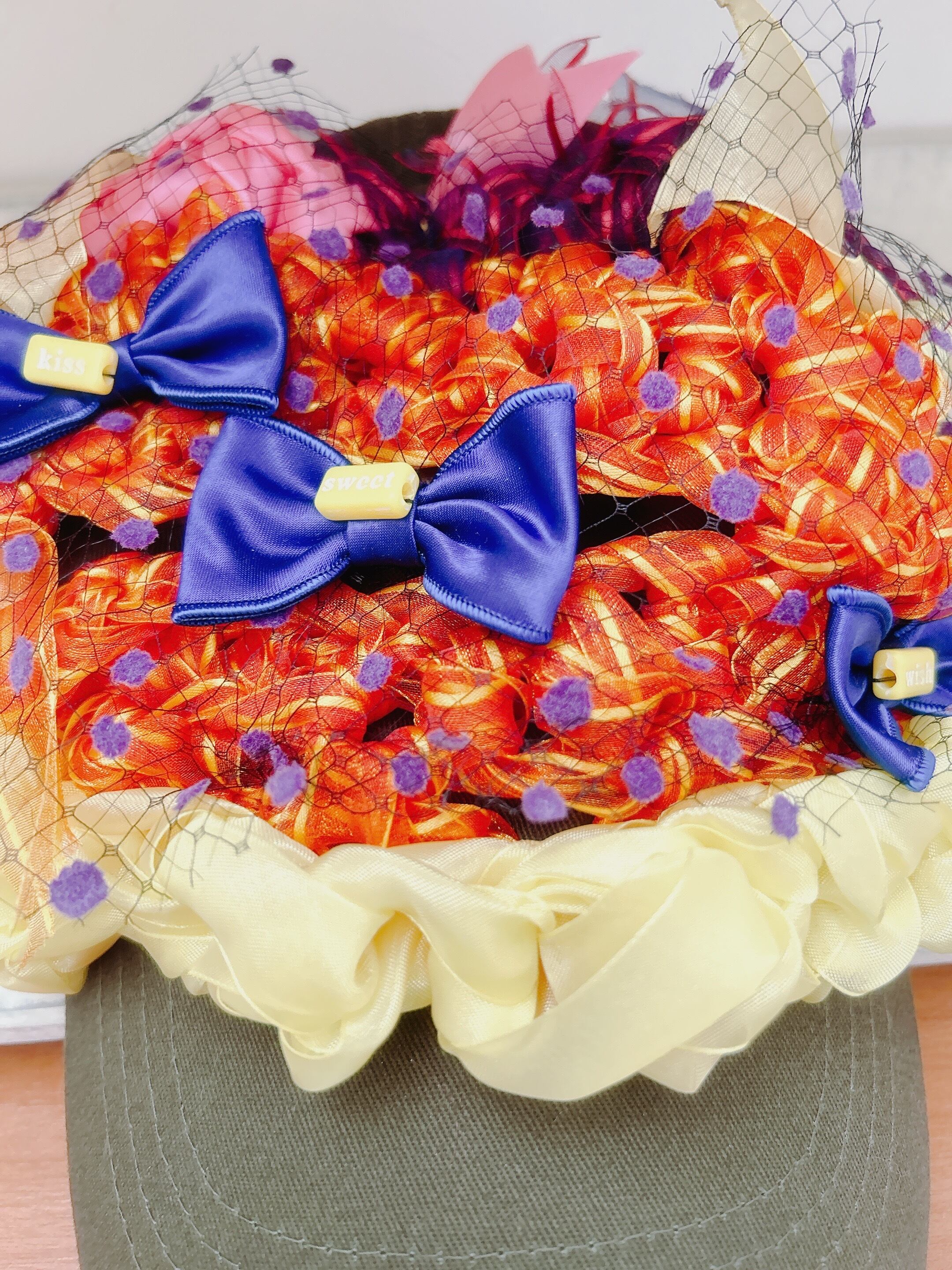 カーキのcapに数種類のリボンを編んで装飾しました。後ろサイズ調節出来ます。