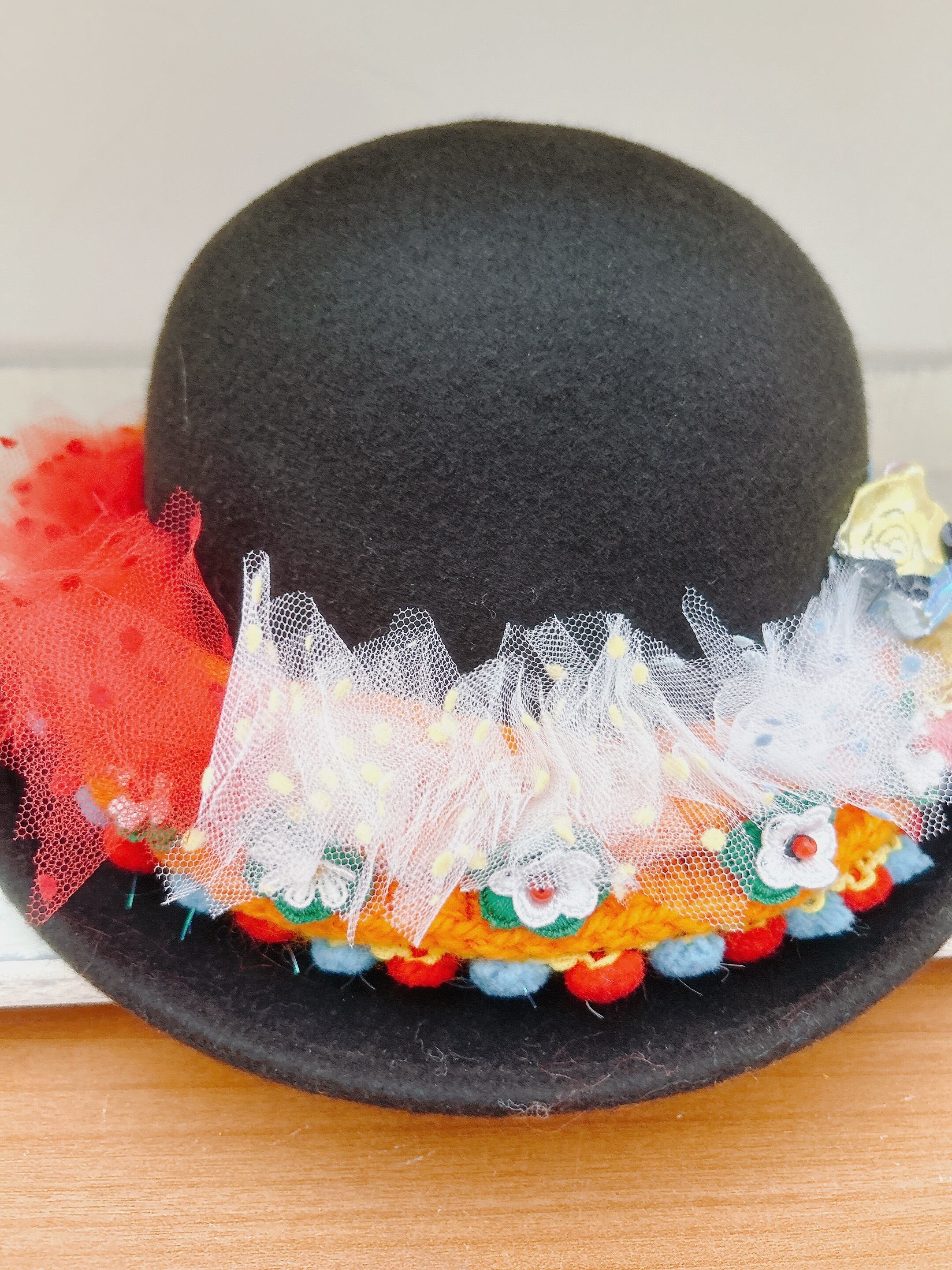 オレンジのニットでポンポンやチュールを編み込み、お花のレースやお花のビーズ、カラフルなチュールレース等を装飾した、大変手の込んだリメイクhatになります。