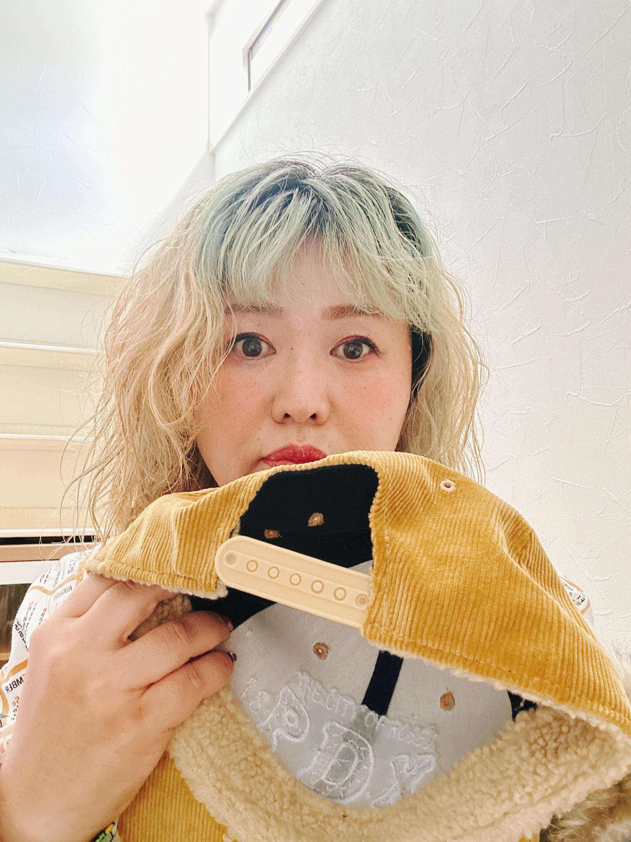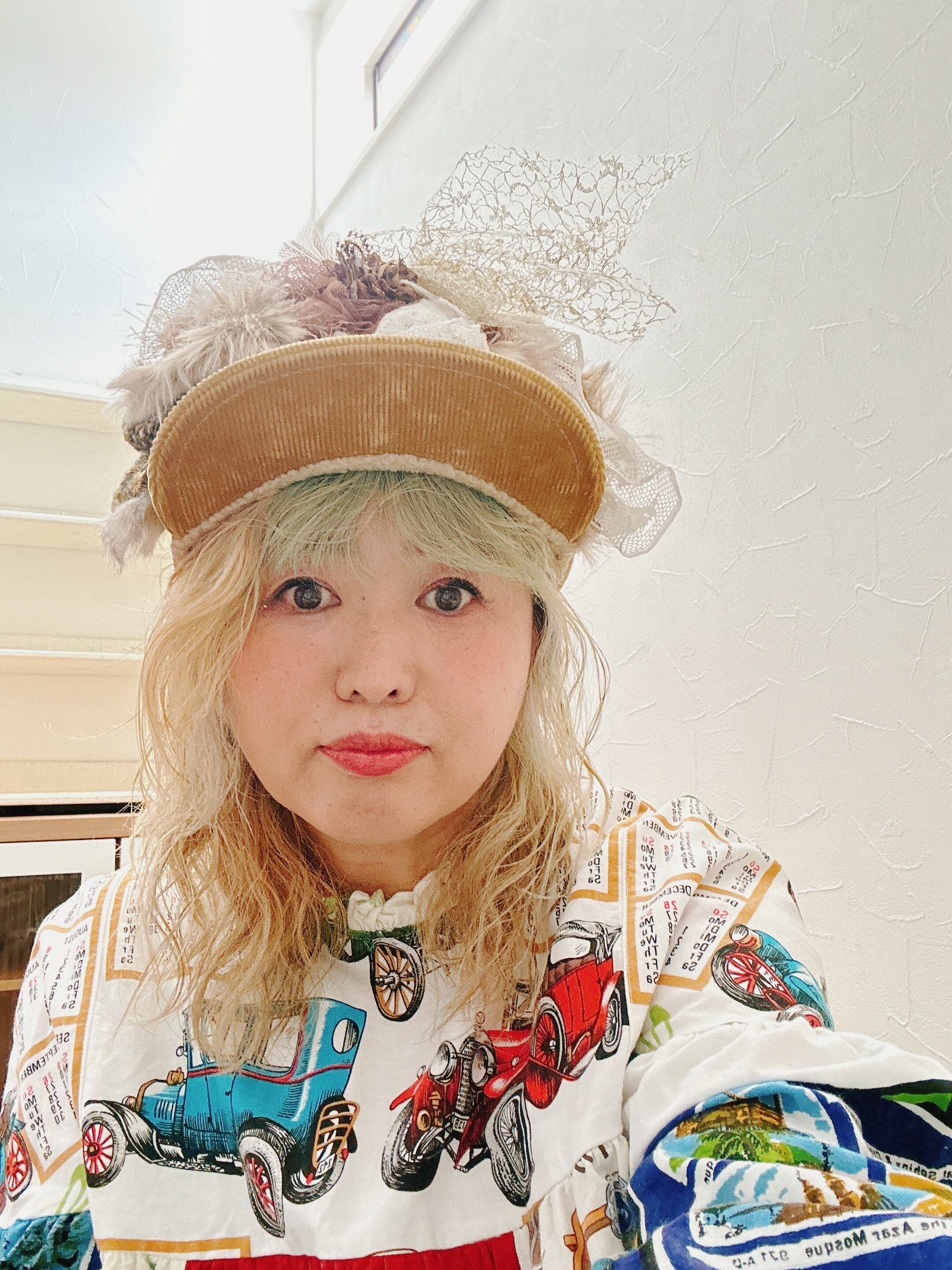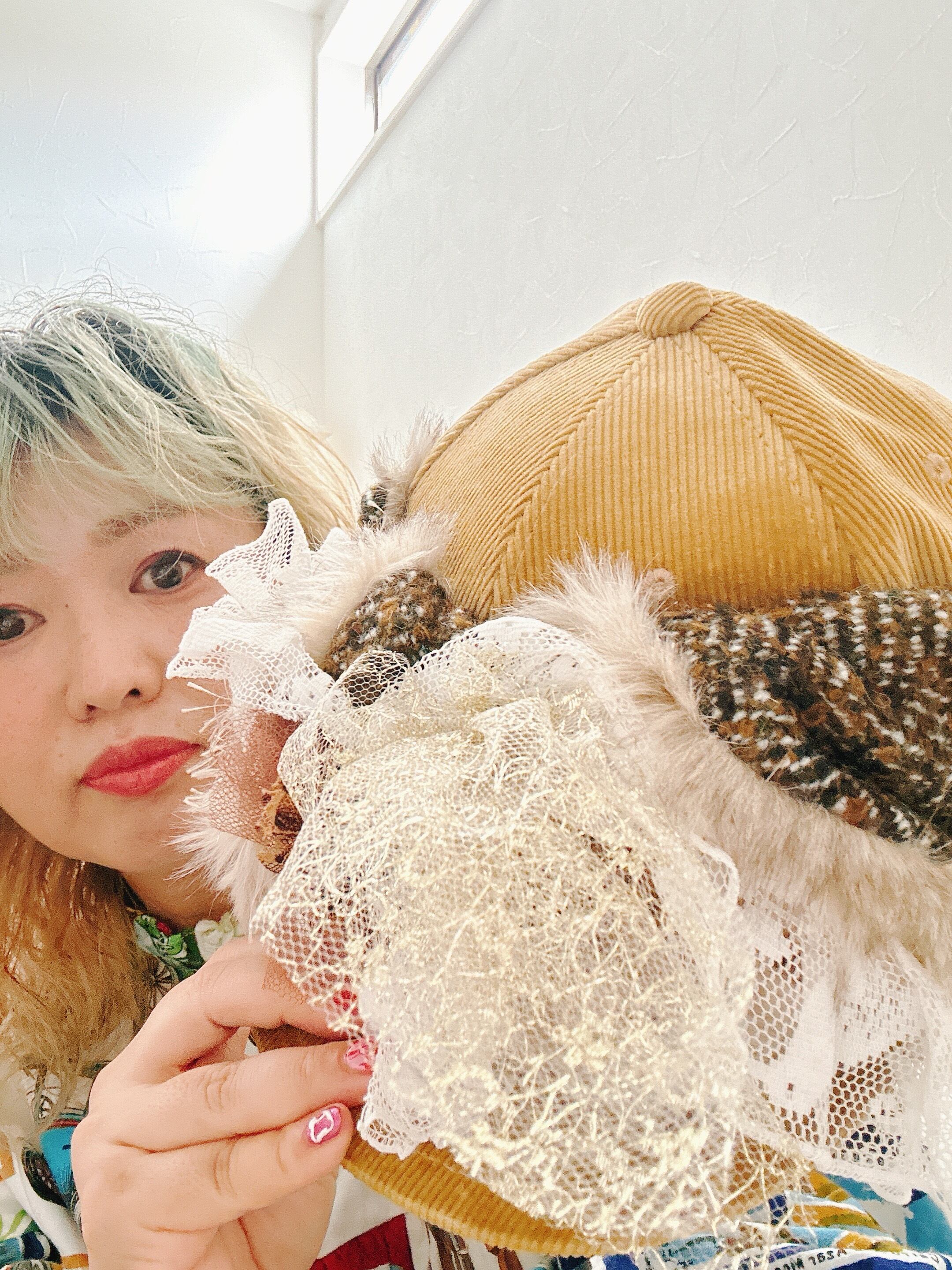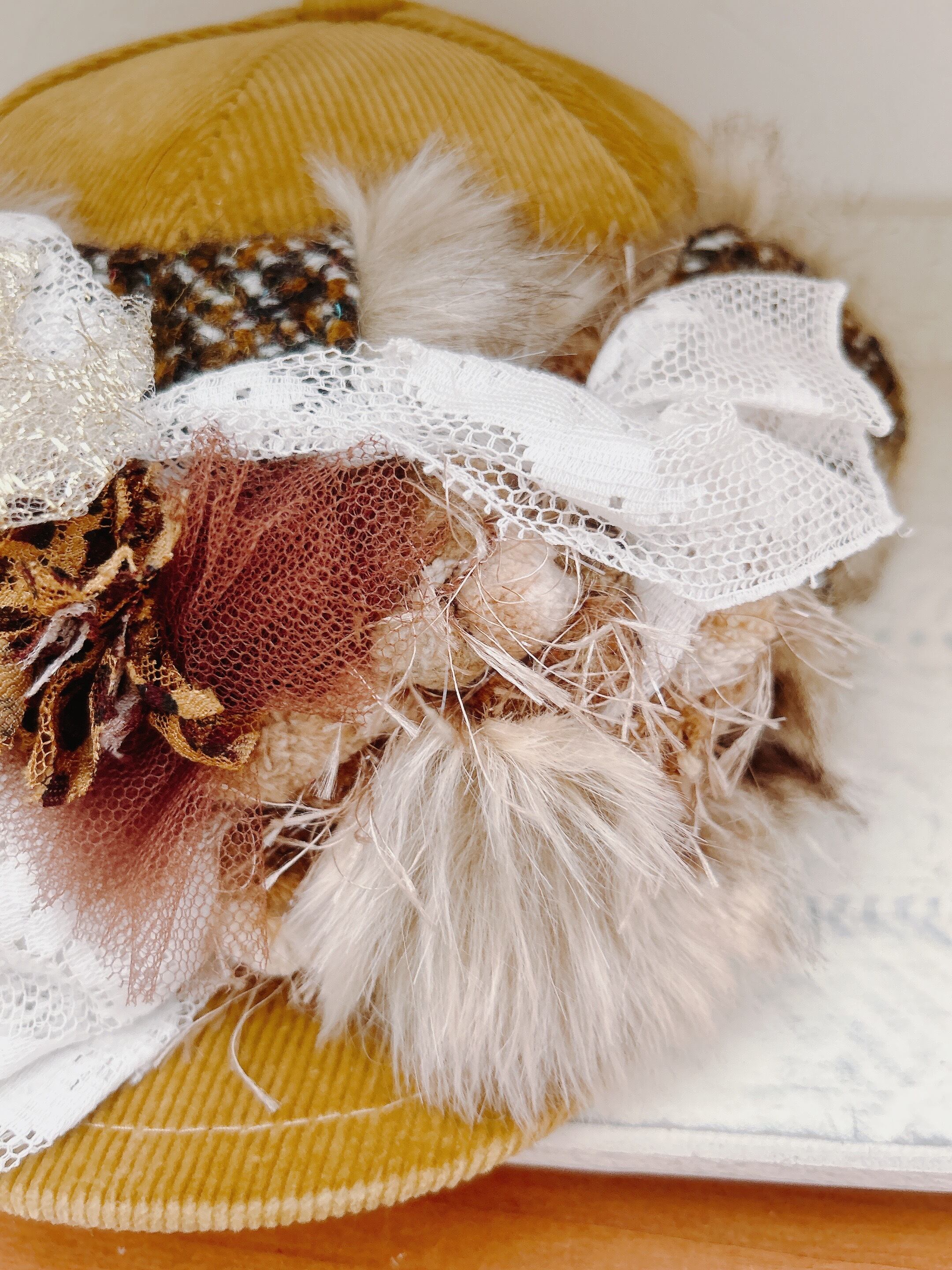 ベージュのコーデュロイcapにフランスのアンティークレースやフェイクファー、チュール等を装飾しております