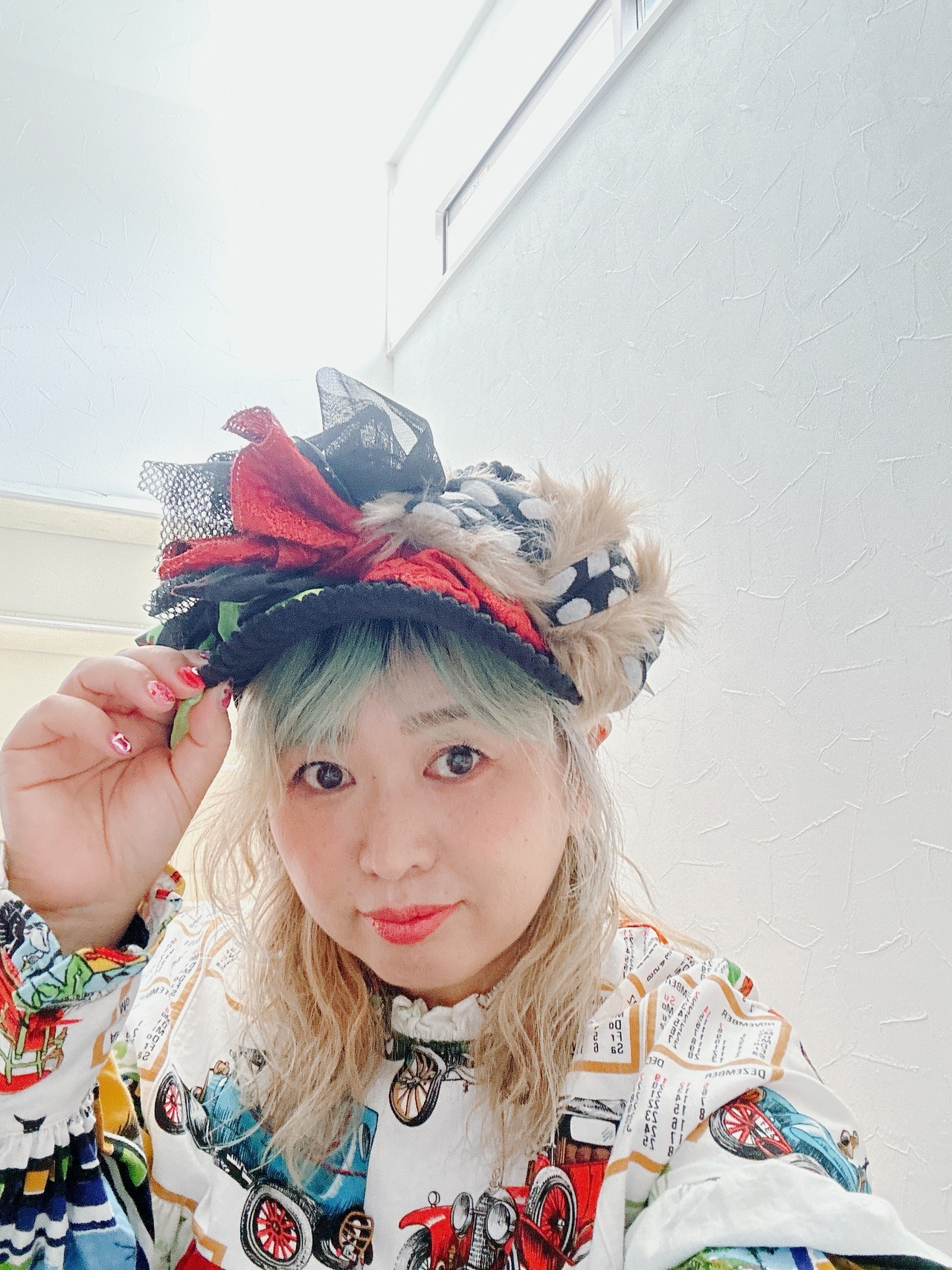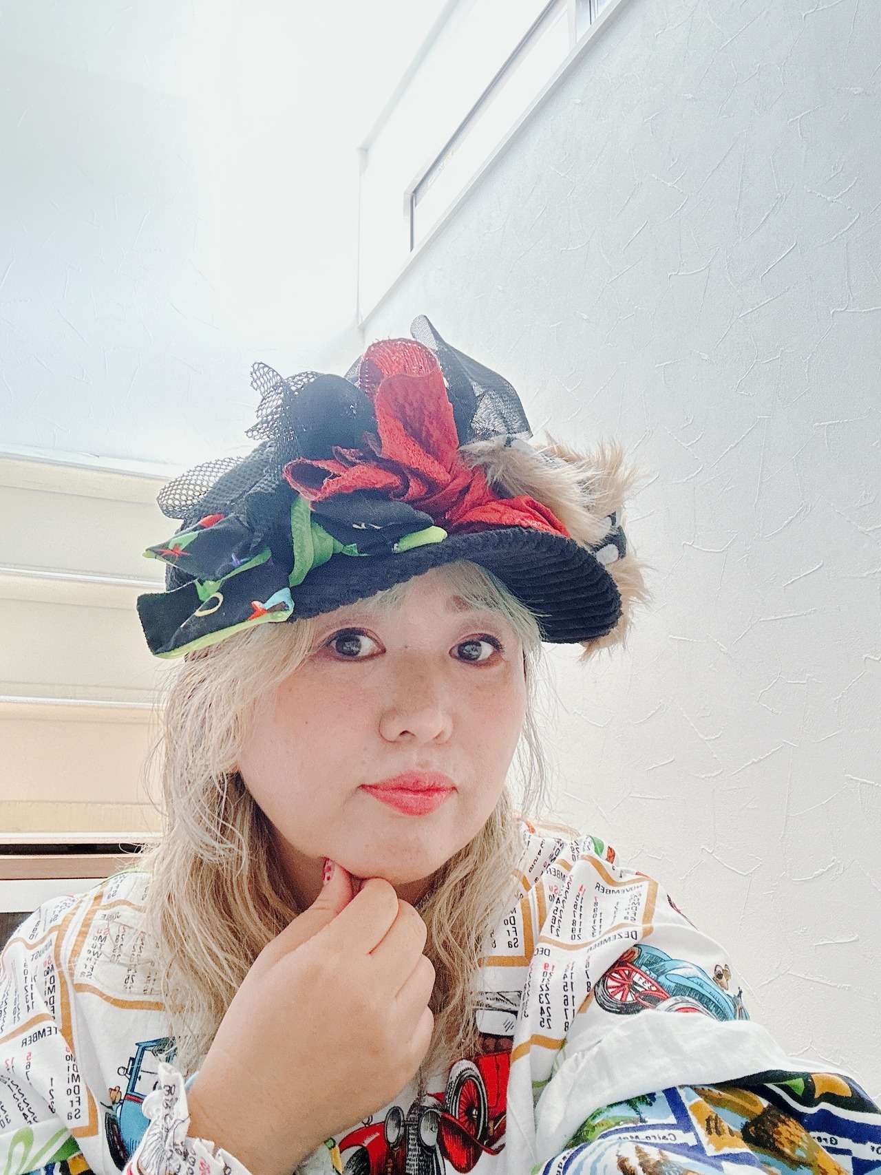 BLACKコーデュロイcapにフェクファーやリボン等を装飾しております
