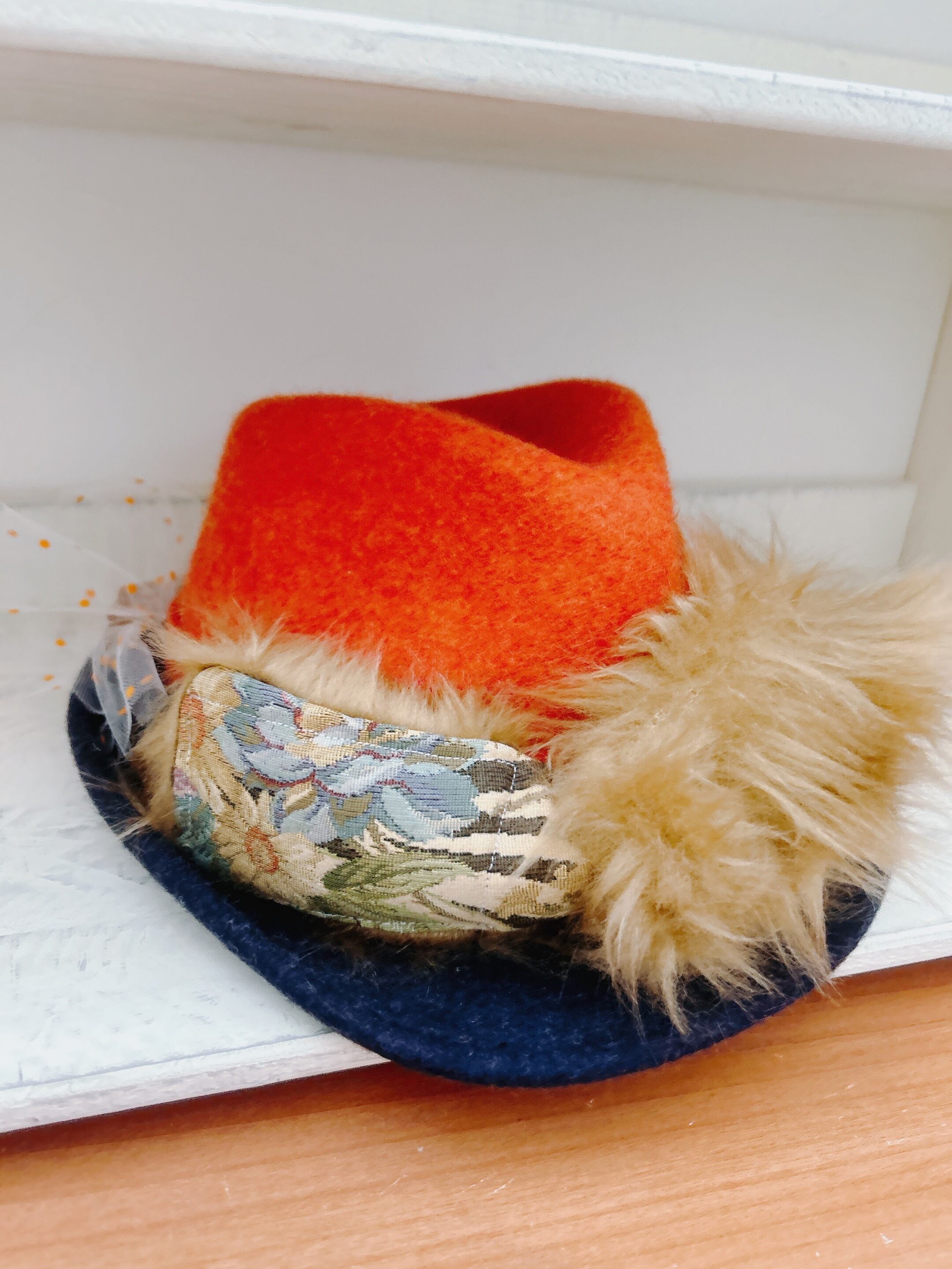 オレンジの中折れhatにゴブラン織りの生地やフェクファー、アンティークボタン等を装飾したリメイクhatになります。