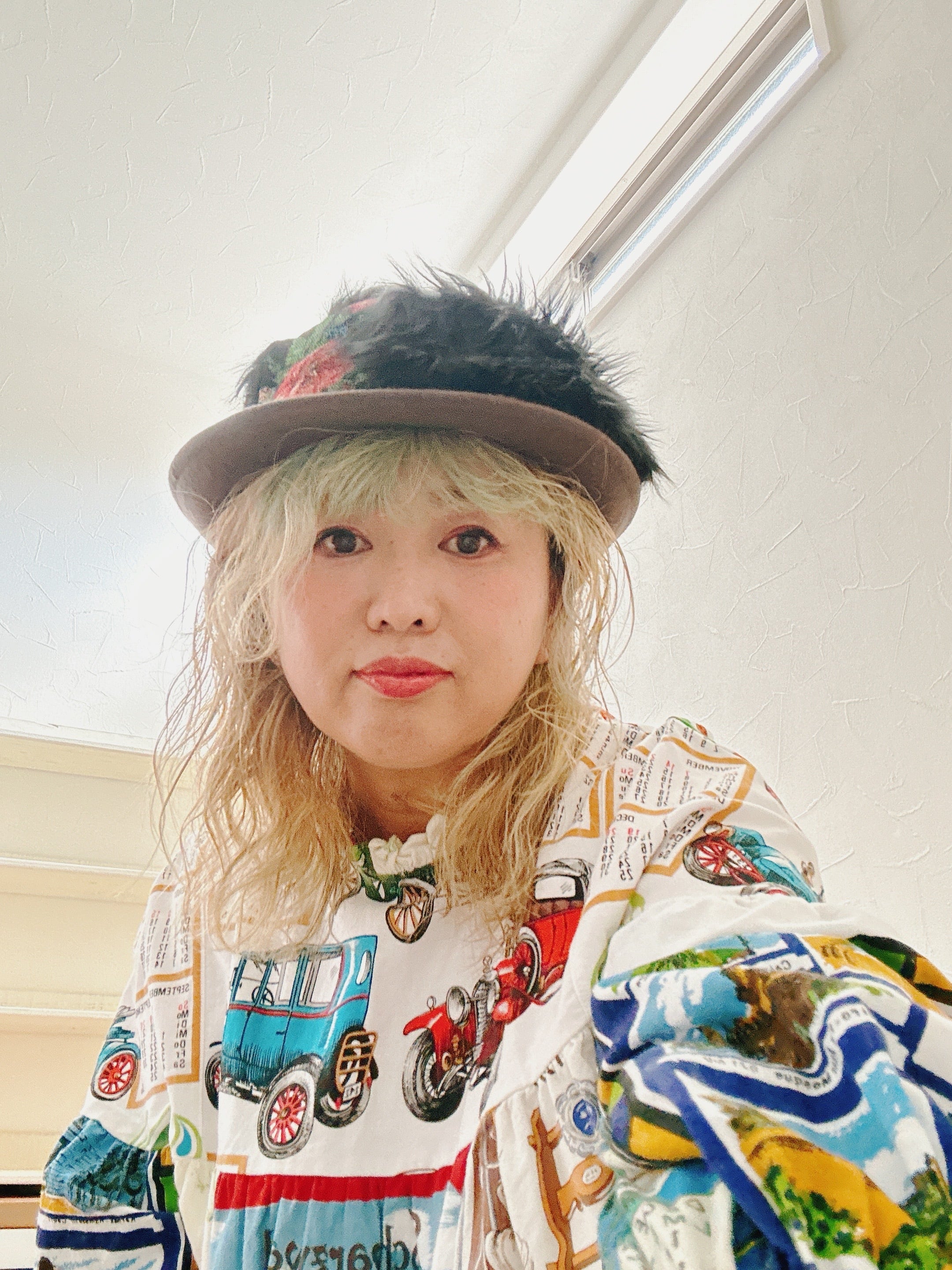 焦茶の中折れhatにゴブラン織りの生地やフェクファー、アンティークボタン、アーティシャルフラワー、チュール等を装飾したリメイクhatになります。