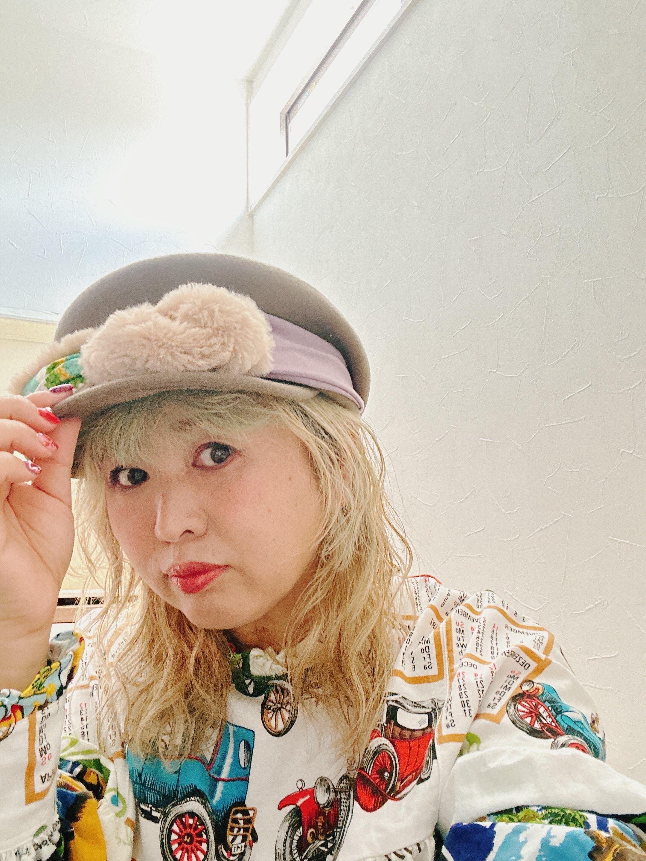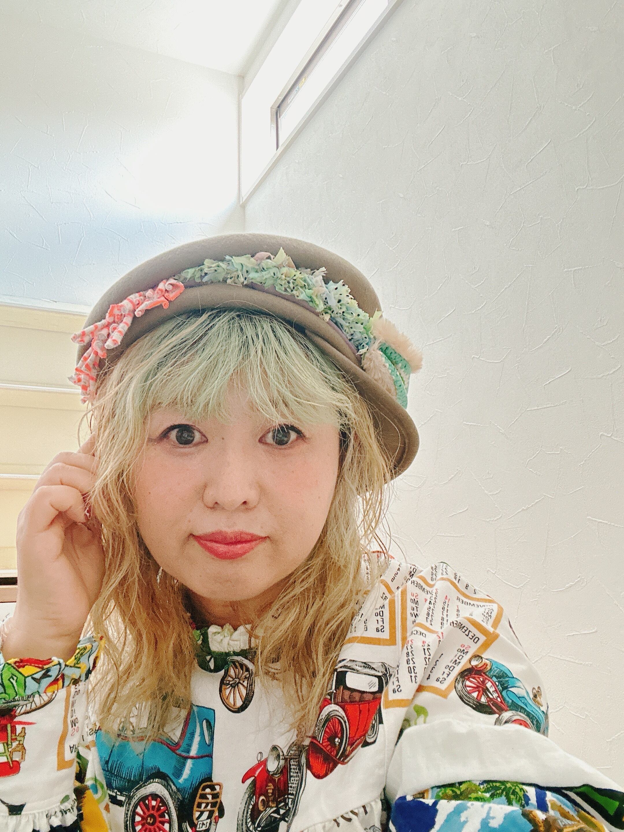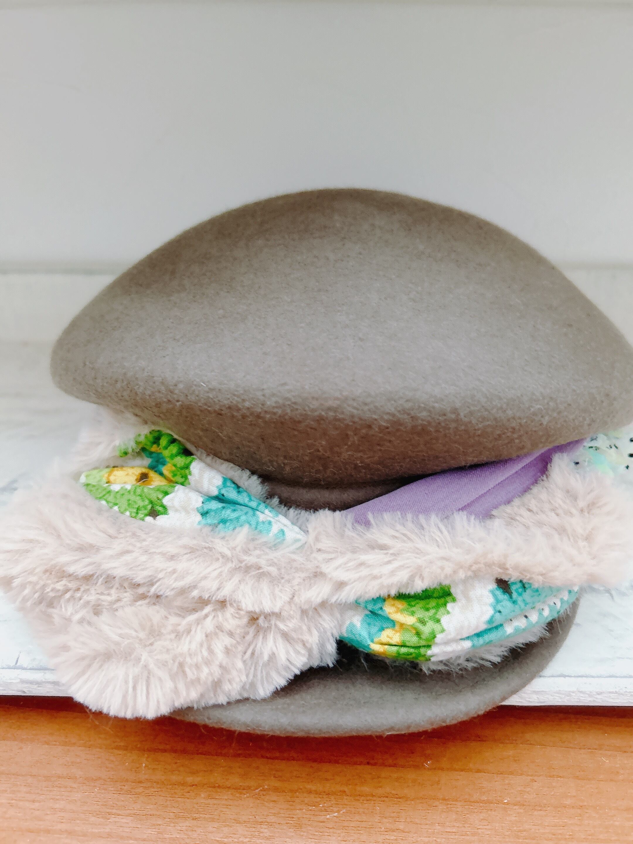 ベージュのフェクファーやグリーンの生地等を装飾したリメイクhatになります