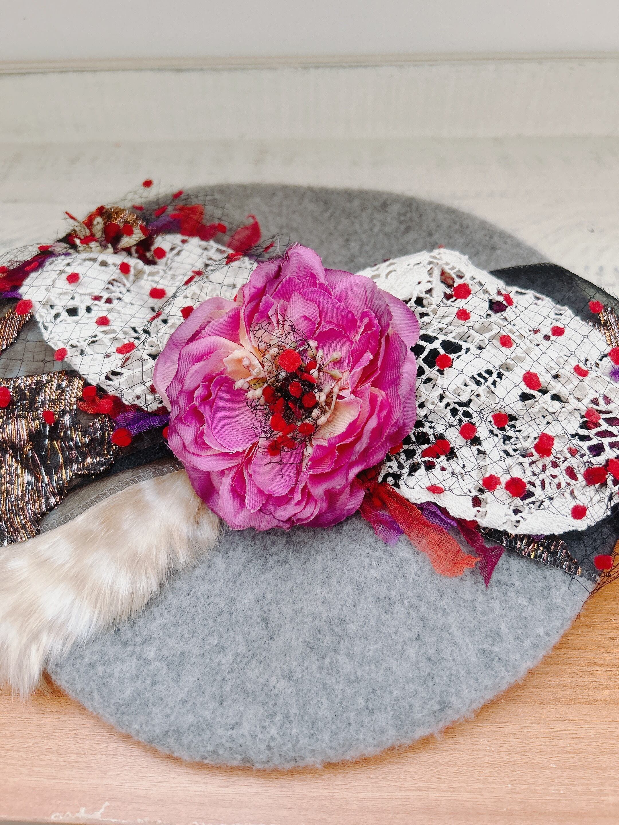 大きなパープルのアーティシャルフラワーやフランスのアンティークレースにニットを施したり赤のドットチュール等を装飾したリメイクベレー帽になります