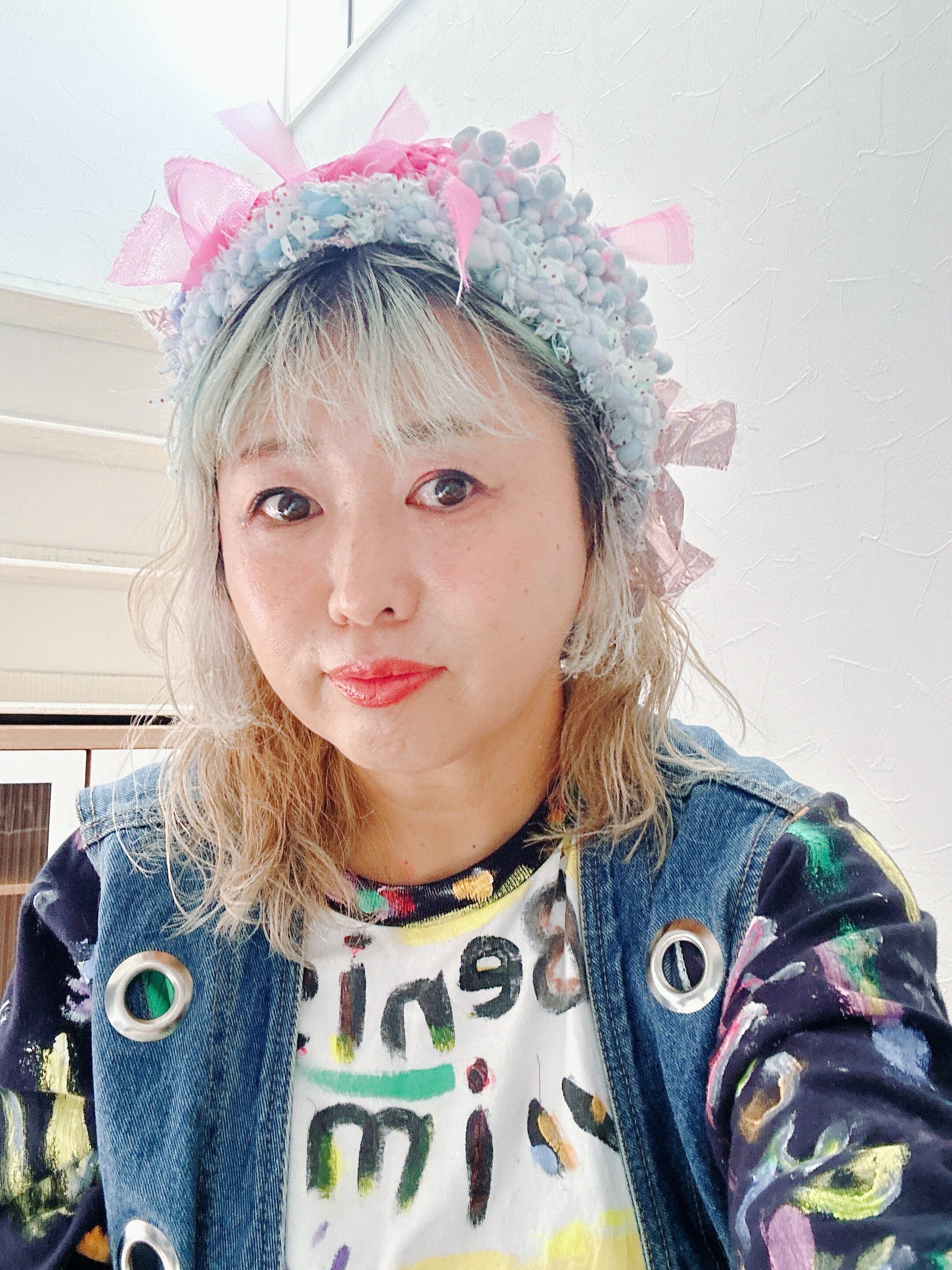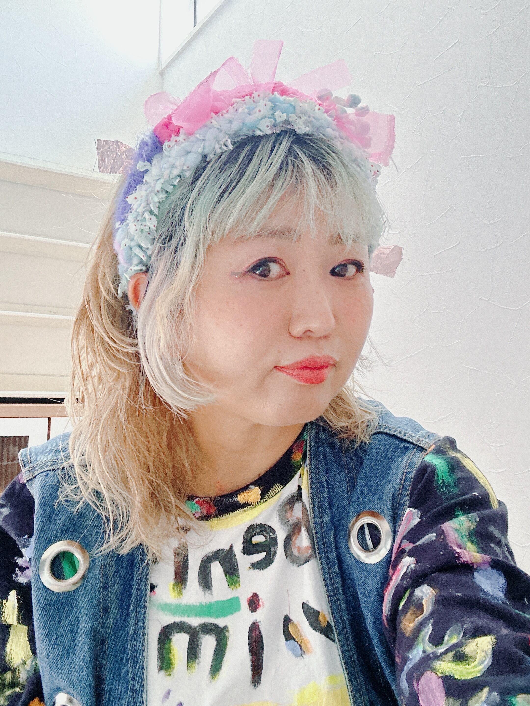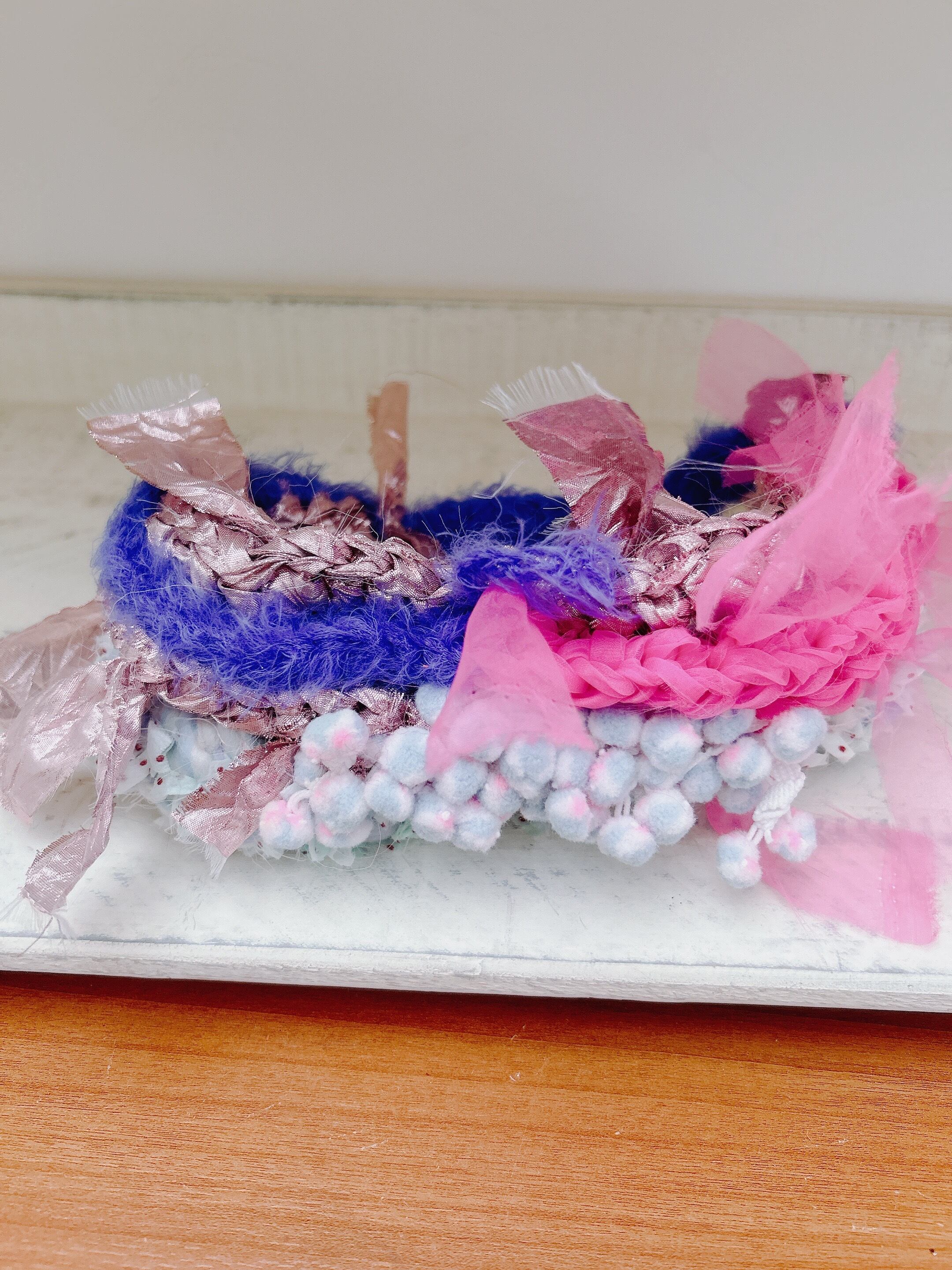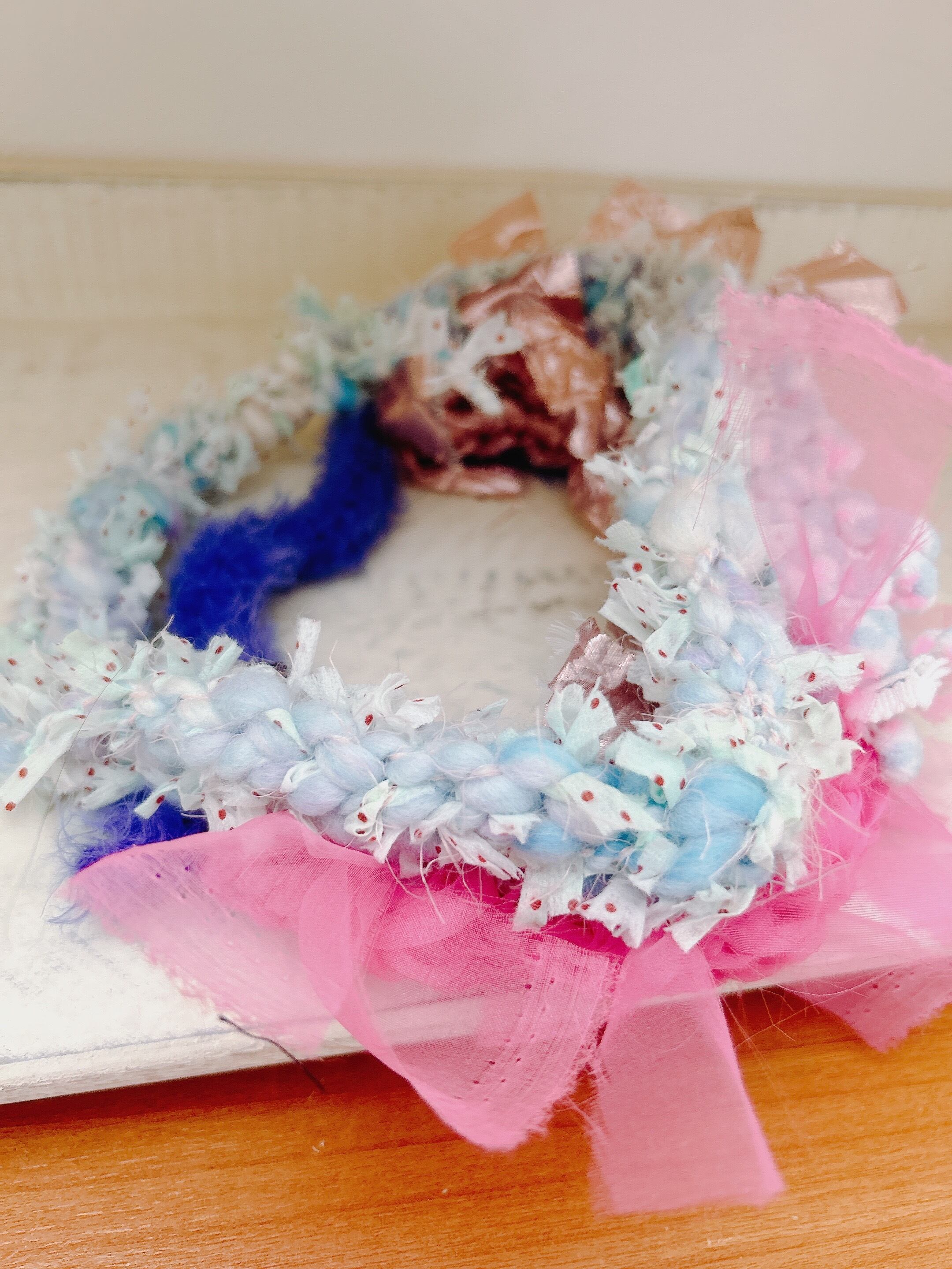 水色、pink、パープル等のニットやチュール、ラメの裂き編みにポンポン等を編み込んだ