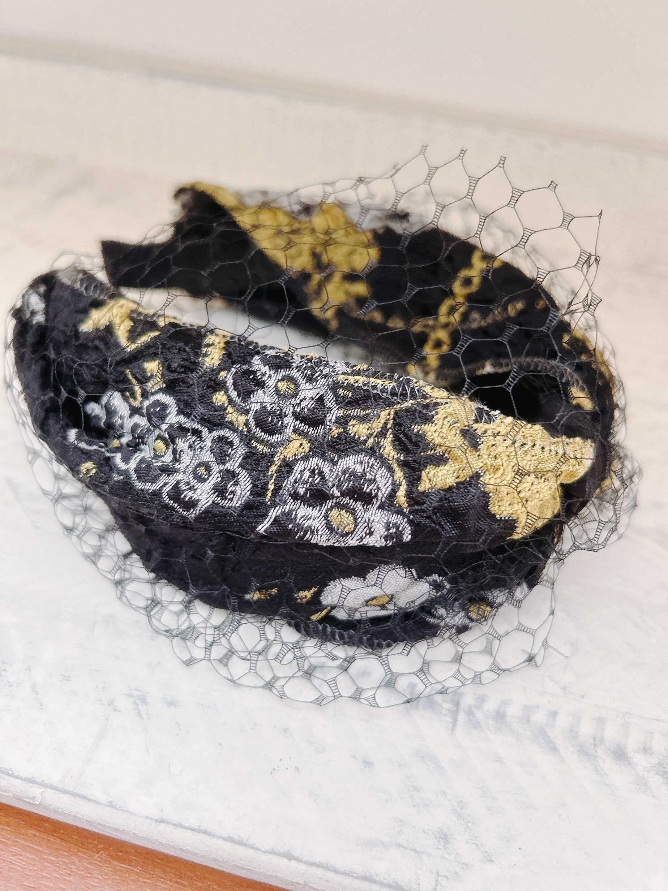 黒地に黄色と白のお花の模様が入った高級生地に黒チュールを組み合わせたカチューシャです
