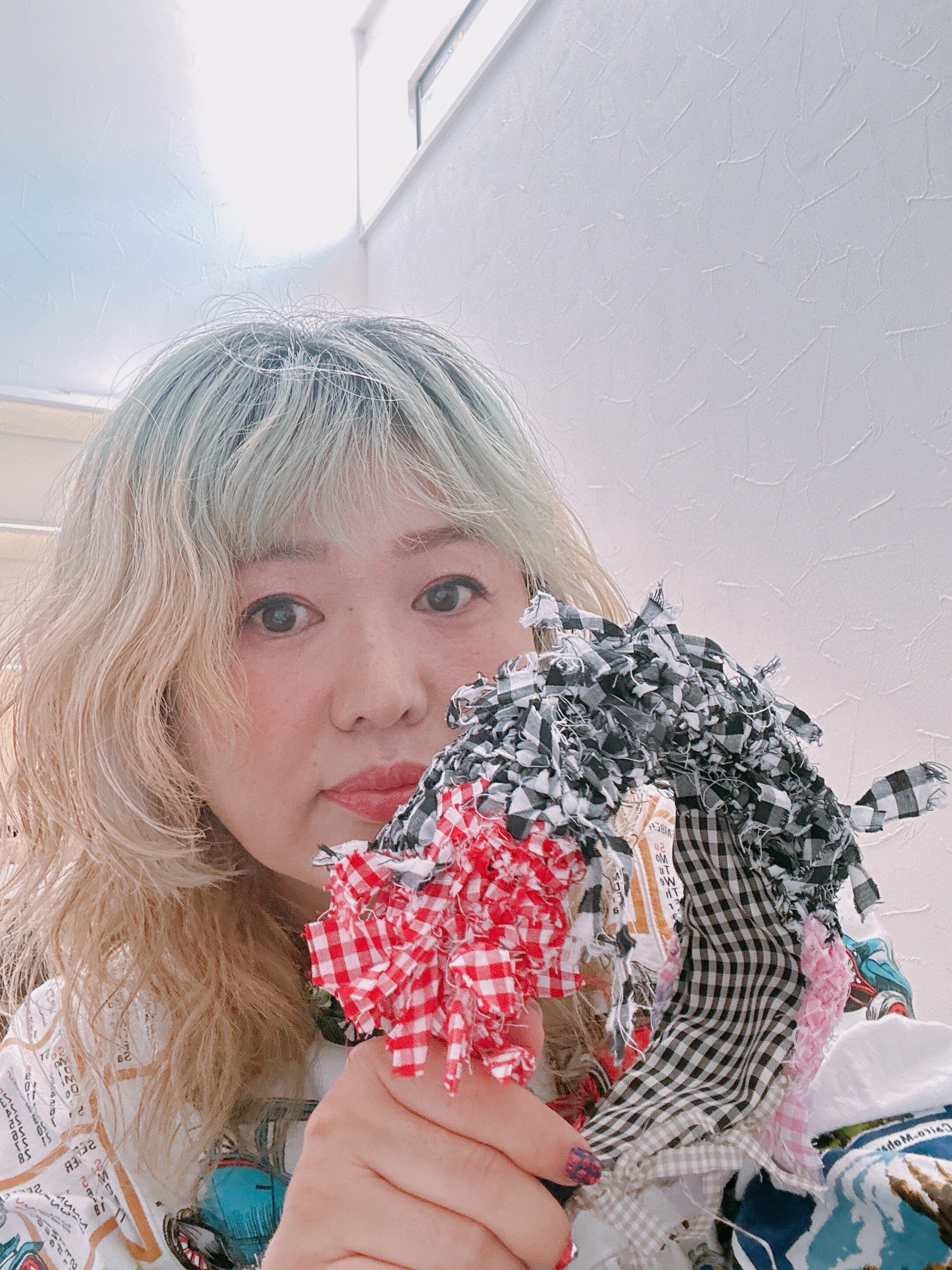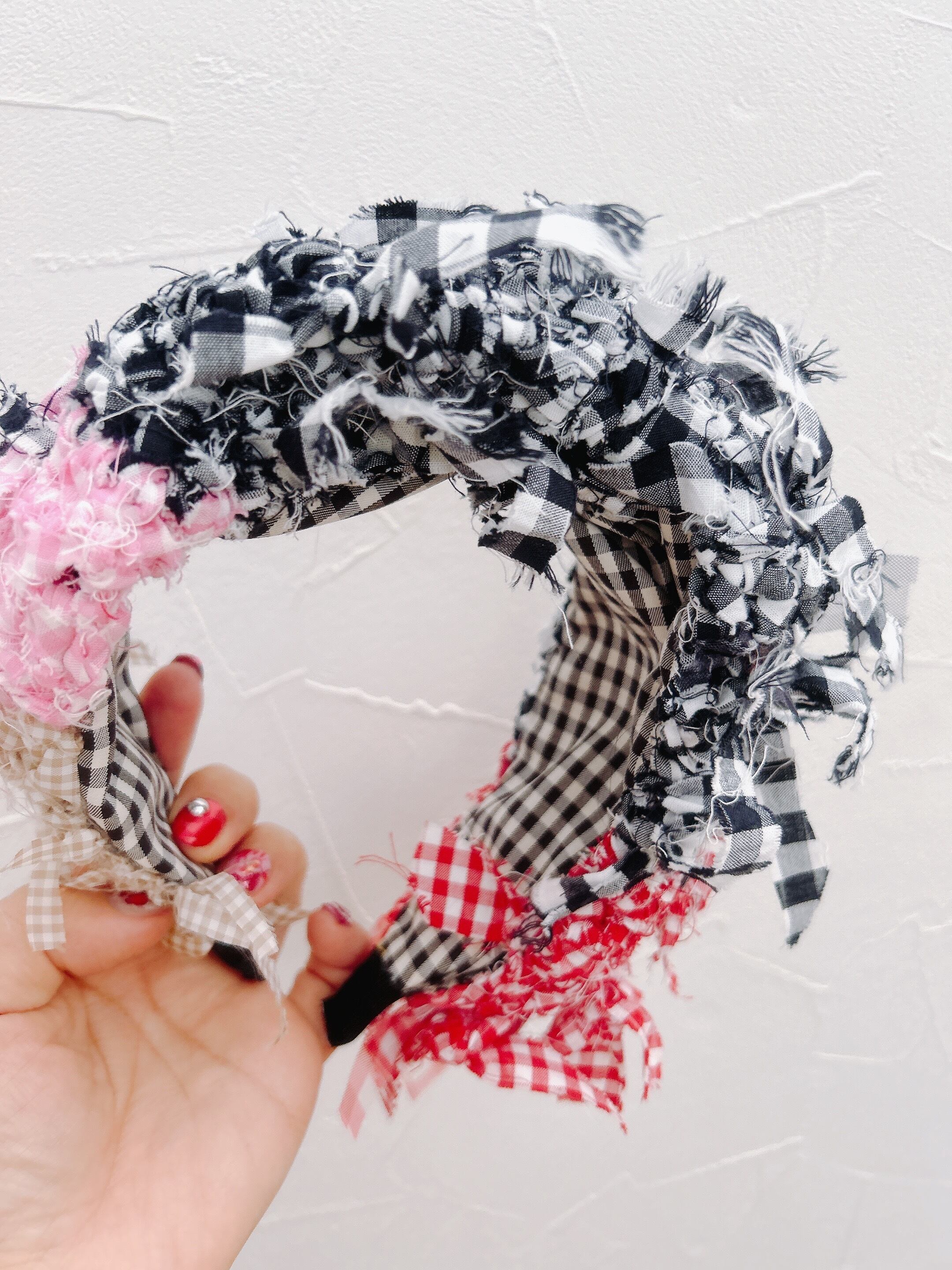 赤、くろ、ピンク、ベージュのギンガムチェックの生地を切って裂き編みしたたカチューシャです