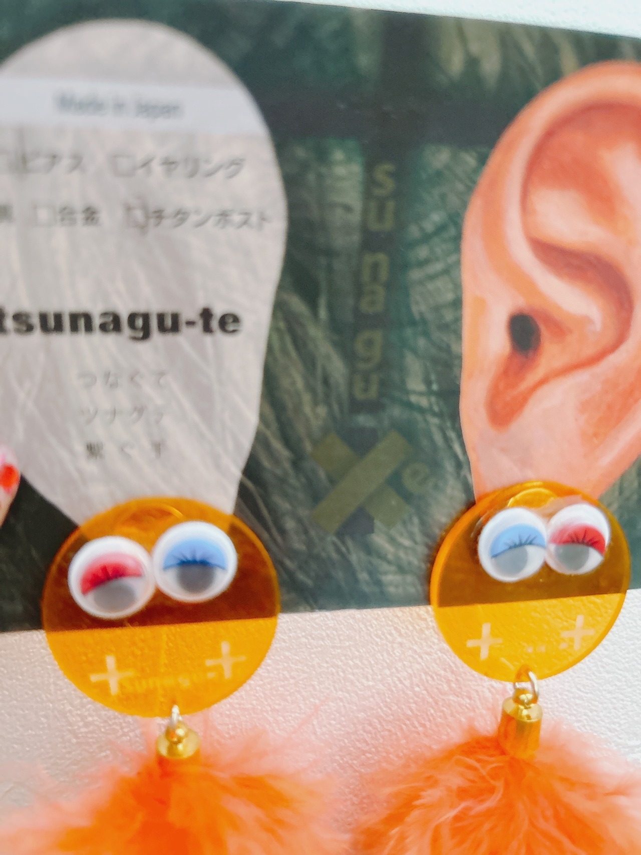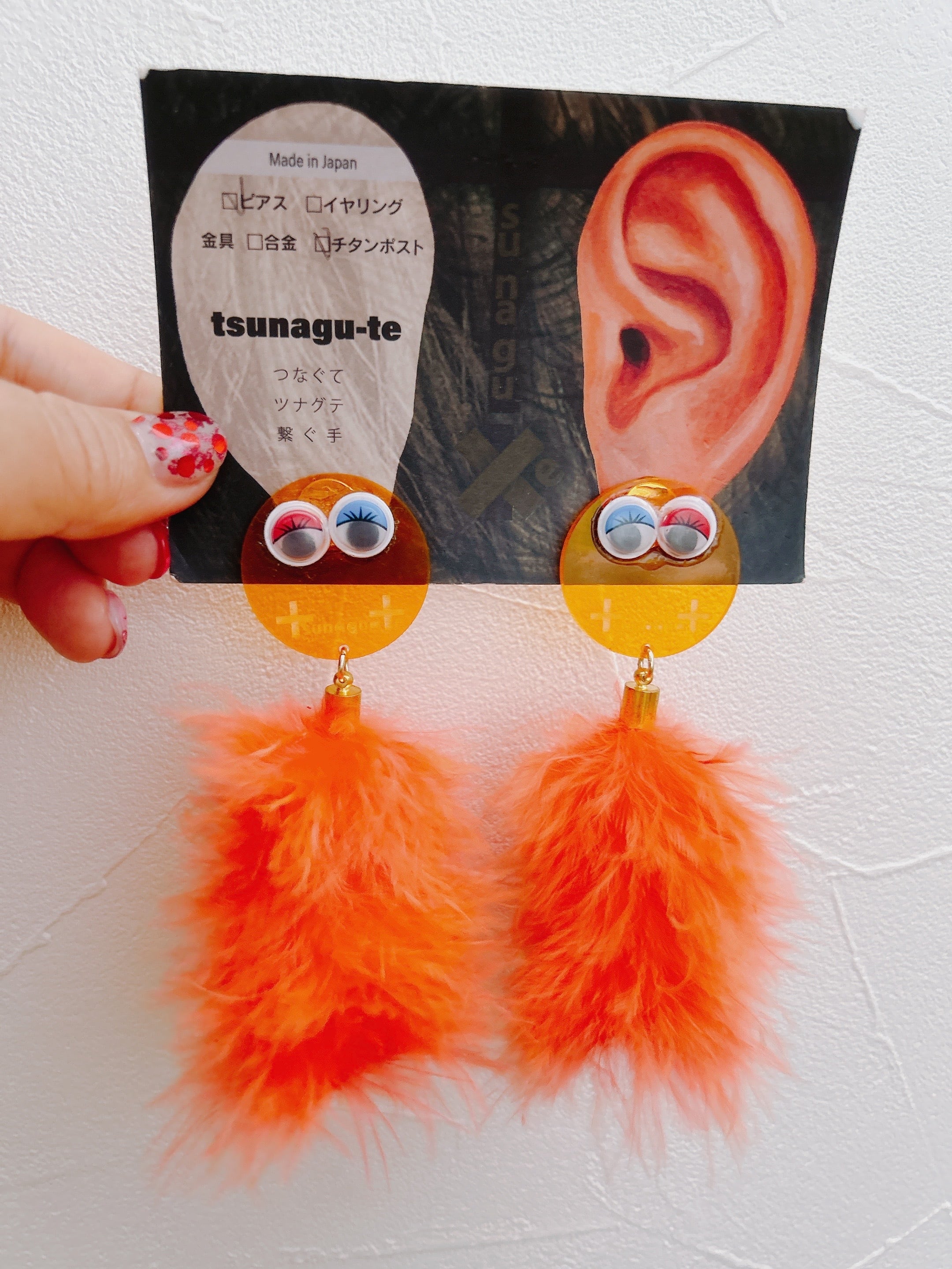 ツナグテちゃんにオレンジのフワフワフェザーが付いたピアスです