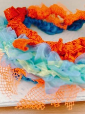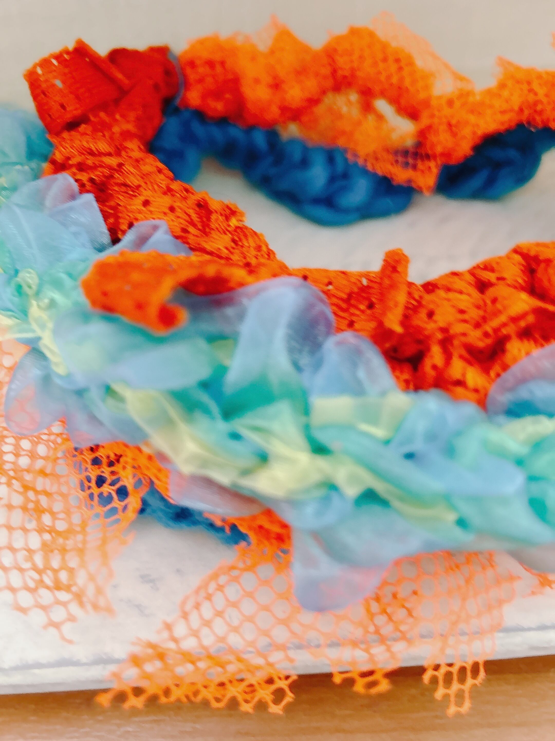 水色、オレンジ等のニットやチュール、裂き編みにポンポン等を編み込んだ