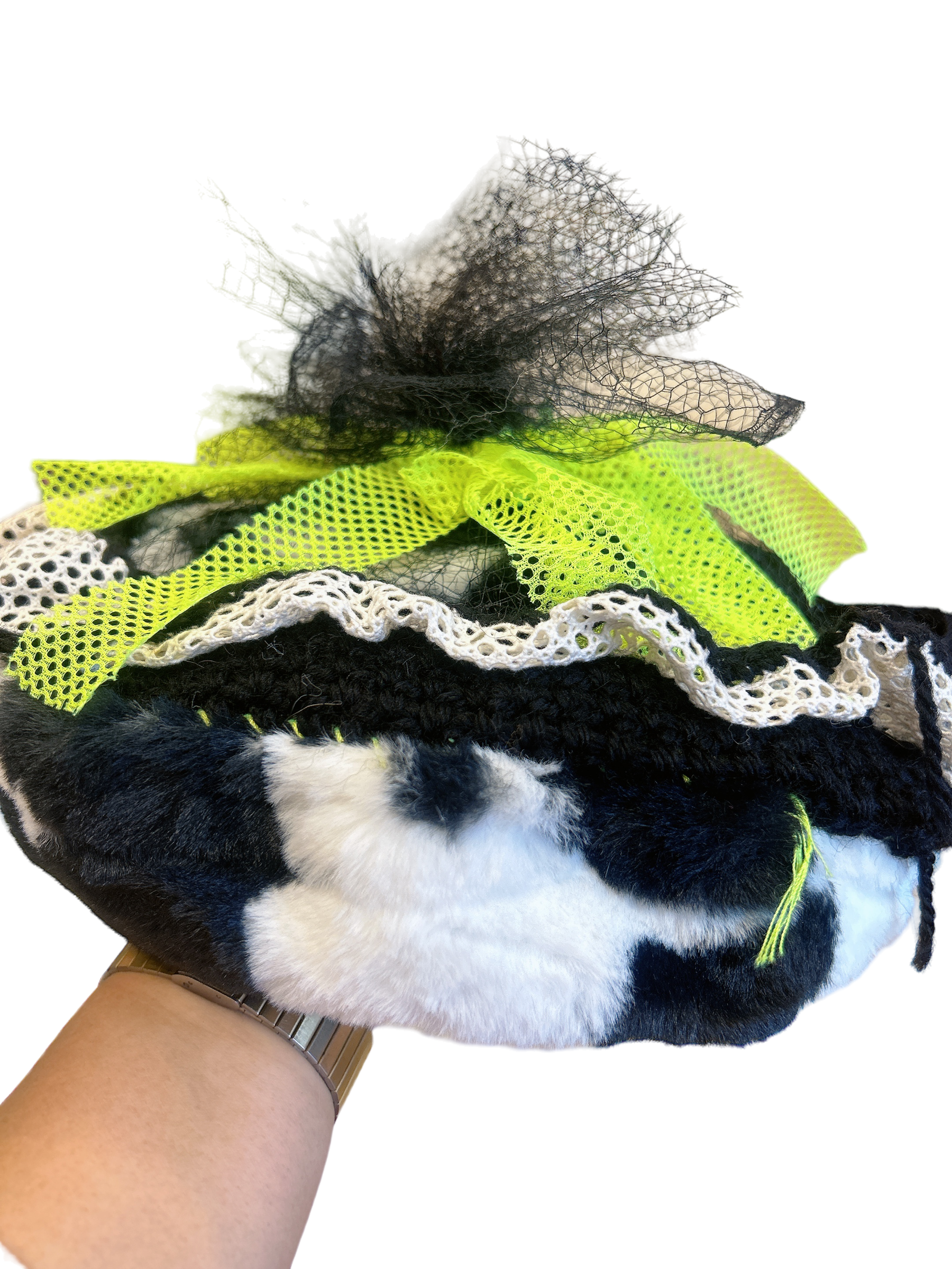 牛柄のフェイクファーがシュウマイの様な形になったカワイイお帽子です。