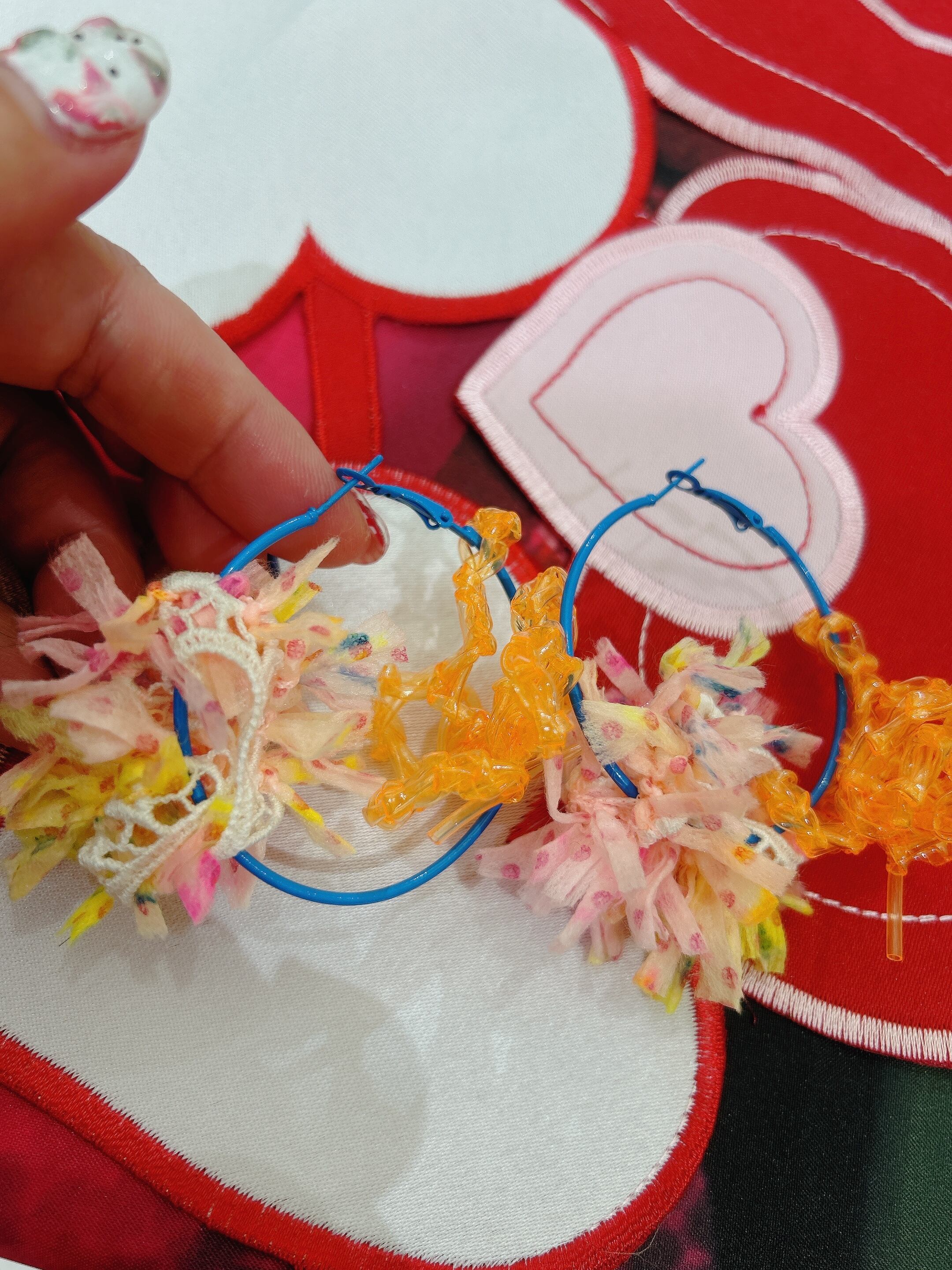 大きなブルーのフープにレースやcolorfulな糸やチューブ等を編み込んだ個性的なピアスです