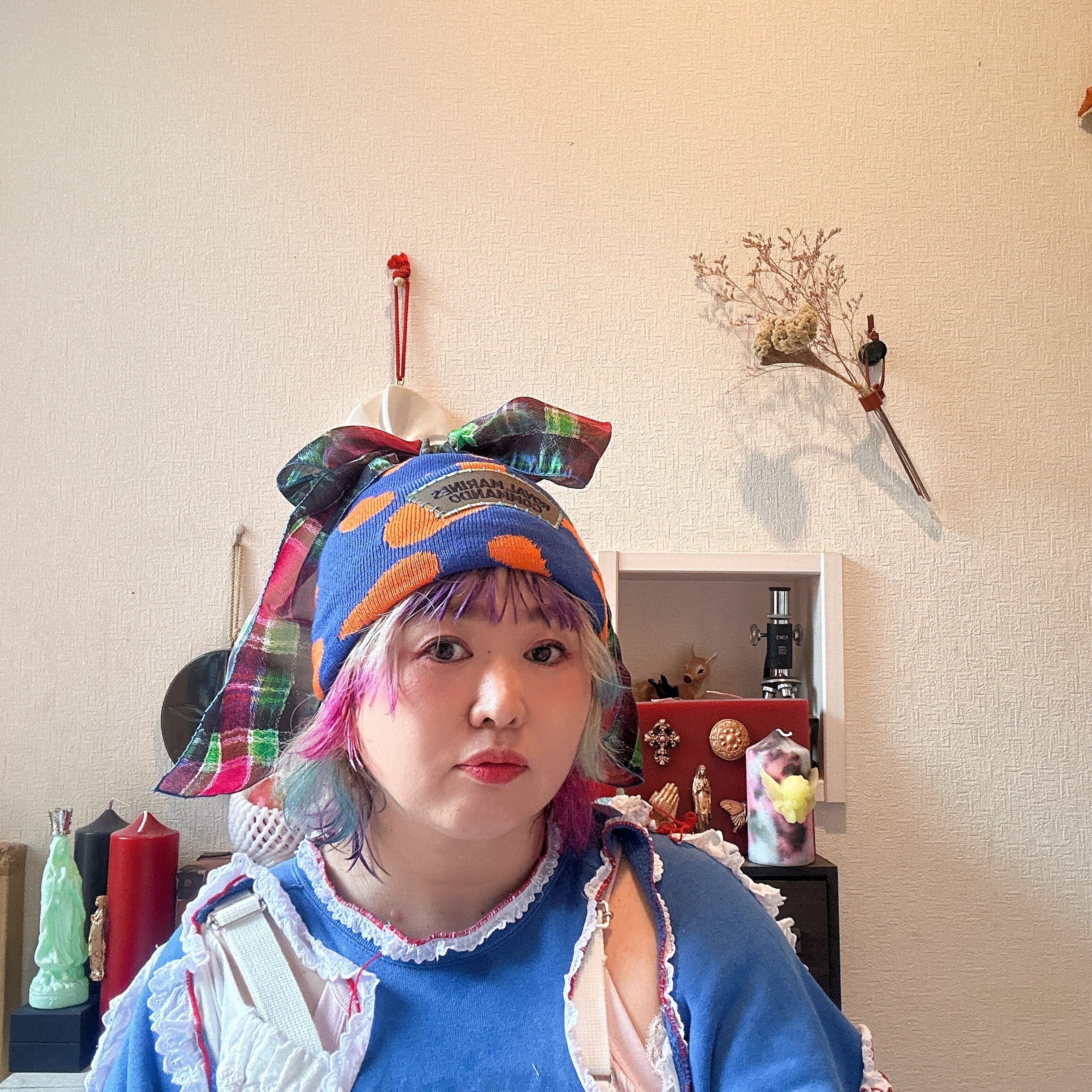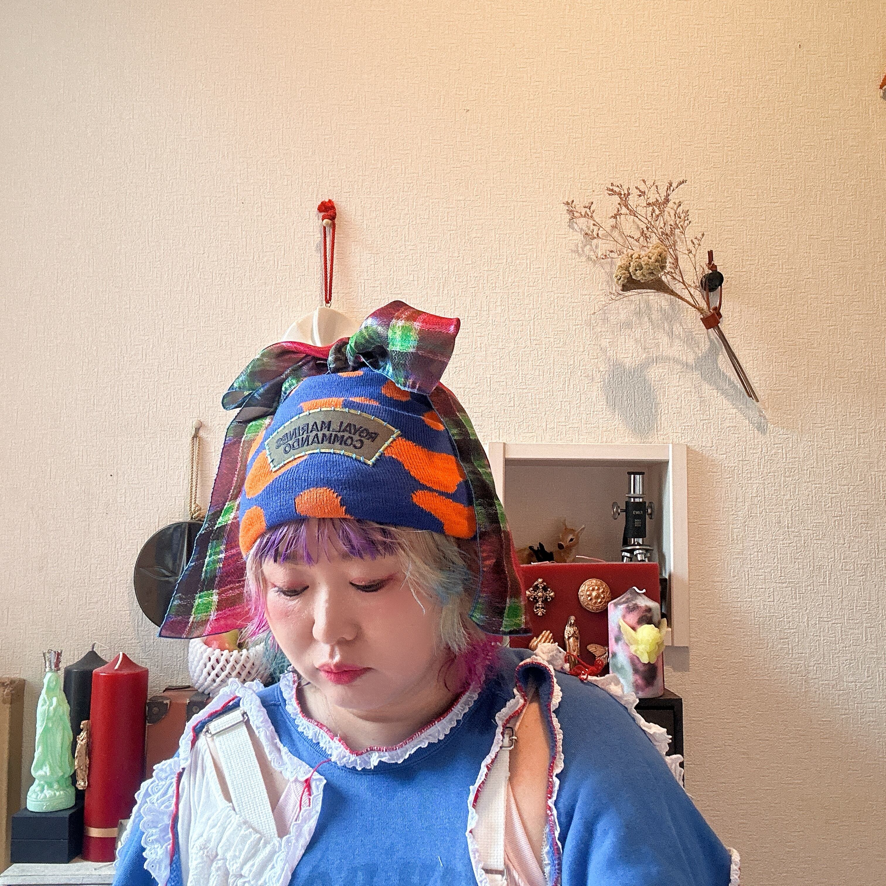 青✖️オレンジのリメイクニット帽です